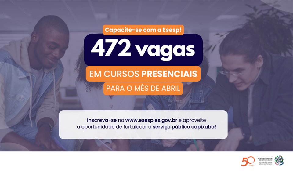 Servidores públicos estaduais e municipais já podem se inscrever para as 472 vagas em cursos presenciais ofertados pela Escola de Serviço Público do Espírito Santo (Esesp), em Vitória, nas turmas programadas para o mês de abril de 2026. As inscrições devem ser realizadas por meio do formulário disponível no site da autarquia, vinculada à Secretaria de Gestão e Recursos Humanos (Seger).