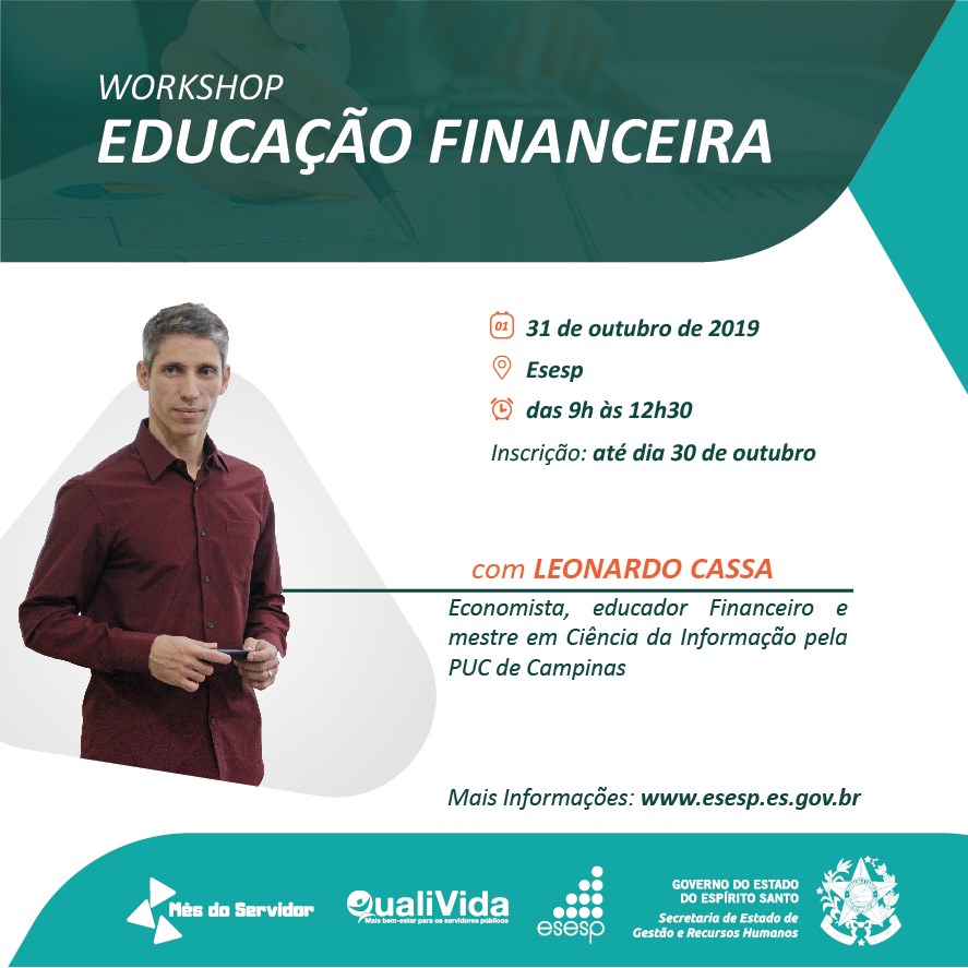 Os servidores públicos que desejam conhecer novas maneiras de utilizar melhor a sua renda já podem se inscrever para o workshop “Educação Financeira”, que será promovido pela Escola de Serviço Público do Espírito Santo (Esesp). A atividade faz parte da programação desenvolvida em alusão ao Mês do Servidor.